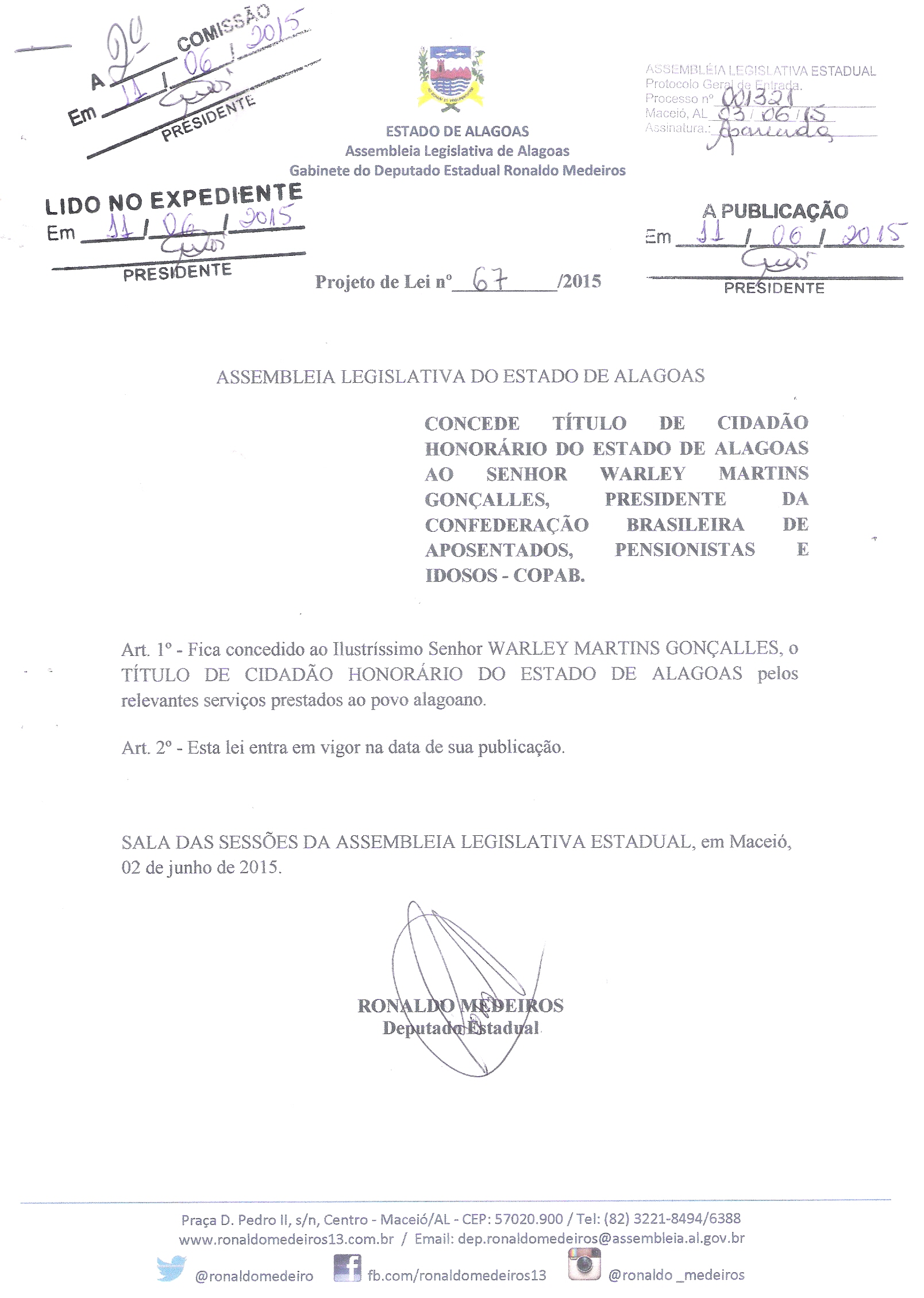 Ementa: CONCEDE TÍTULO DE CIDADÃO HONORÁRIO DO ESTADO DE ALAGOAS AO EXCELENTÍSSIMO SENHOR DOUTOR PAULO MACHADO CORDEIRO, DESEMBARGADOR FEDERAL DO TRF DA 5ª REGIÃO.